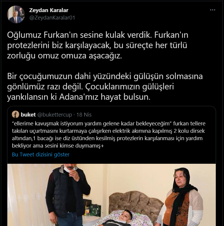 Karalar Twitter'dan yaptığı açıklamada "Oğlumuz Furkan'ın sesine kulak verdik. Furkan'ın protezlerini biz karşılayacak, bu süreçte her türlü zorluğu omuz omuza aşacağız. Bir çocuğumuzun dahi yüzündeki gülüşün solmasına gönlümüz razı değil. Çocuklarımızın gülüşleri yankılansın ki Adana'mız hayat bulsun." ifadelerine yer verdi.