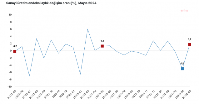 TÜİK, mayıs ayı sanayi üretimi verilerini açıkladı. Buna göre, sanayi üretimi yıllık yüzde 0,1 azaldı. Sanayinin alt sektörleri incelendiğinde, 2024 yılı mayıs ayında madencilik ve taş ocakçılığı sektörü endeksi bir önceki yılın aynı ayına göre yüzde 2,2 arttı, imalat sanayi sektörü endeksi yüzde 0,4 azaldı ve elektrik, gaz, buhar ve iklimlendirme üretimi ve dağıtımı sektörü endeksi yüzde 0,9 arttı.