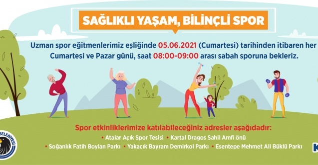 5 Haziran 2021 Cumartesi tarihinden itibaren her cumartesi ve pazar günleri 08.00 – 09.00 saatleri arasında uzman eğitmenler tarafından verilecek olan etkinlikler; Atalar Açık Spor Tesisi, Kartal Dragos Sahil Amfi önü, Soğanlık Fatih Boylan Parkı, Yakacık Bayram Demirkol Parkı ve Esentepe Mehmet Ali Büklü Parkı’nda gerçekleştirilecek.