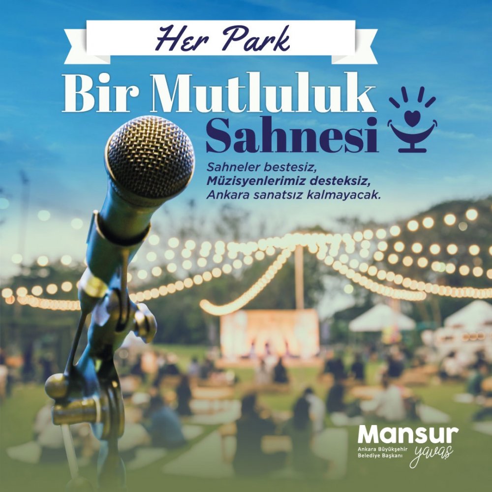 Ankara Büyükşehir Belediyesi, pandemi sürecinde zor günler geçiren müzisyenlere destek olmaya devam ediyor. ‘Her Park Bir Mutluluk Sahnesi’ adlı destek projesini sosyal medya hesaplarından duyuran Ankara Büyükşehir Belediye Başkanı Mansur Yavaş, “Sahneler bestesiz, müzisyenlerimiz desteksiz, Ankara sanatsız kalmayacak” dedi. Mutluluk Sahneleri, 16 Haziran Çarşamba günü Gençlik Parkı ve Kuğulu Park’ta gerçekleşecek konserlerle başlayacak. Müzisyenlere nakdi destek de sağlanacak.