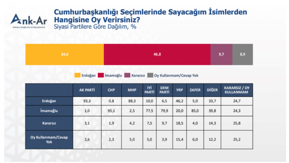Ank-Ar'ın (Ankara Araştırma ve Danışmanlık) 4-8 Nisan tarihleri arasında 28 il 57 ilçede yaptığı anketin sonuçlarını açıkladı. 2004 kişiyle yüz yüze yapılan ankette seçmenler merak eden 3 soruyu yanıtladı.
