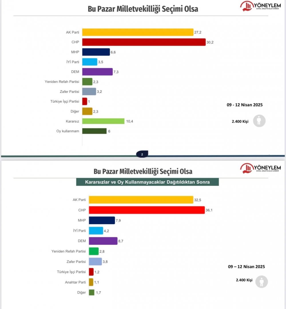 Nisan ayında 81 ilde "Bu pazar günü seçim olsa hangi partiye oy verirsiniz?" sorusuna yanıt veren 2 bin 400 katılımcının yüzde 30,2'si CHP'yi, yüzde 27,2'si AKP'ye oy vereceğini yüzde 10'u ise kararsız olduğunu belirtti.