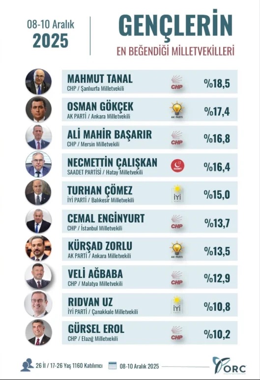 ORC Araştırma Şirketi, “Gençlerin en beğendiği milletvekili” araştırmasını yayınlandı.