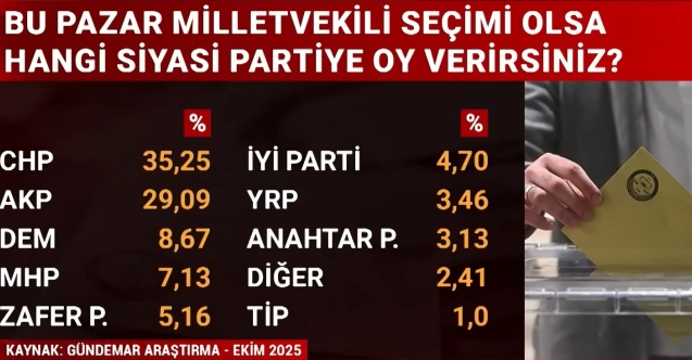 Gündemar'ın son anketinde CHP yüzde 35,25 ile birinci parti olurken AKP yüzde 30'un altında kalmaya devam etti. Ankette MHP yüzde 7,13 ile baraj üstünde kalırken Zafer Partisi yüzde 5,16 oyuyla dikkat çekti. 2'nci tur anketinde ise Mansur Yavaş, Ekrem İmamoğlu ve Özgür Özel; Erdoğan'a karşı önde yer aldı.