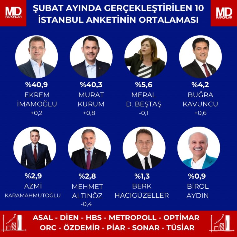 ASAL, DİEN, HBS, MetroPOLL, Optimar, ORC, Özdemir, PİAR, SONAR ve TÜSİAR'ın şubat ayı anketlerine göre, İstanbul'da yarışan adayların aldıkları puanlar belli oldu.