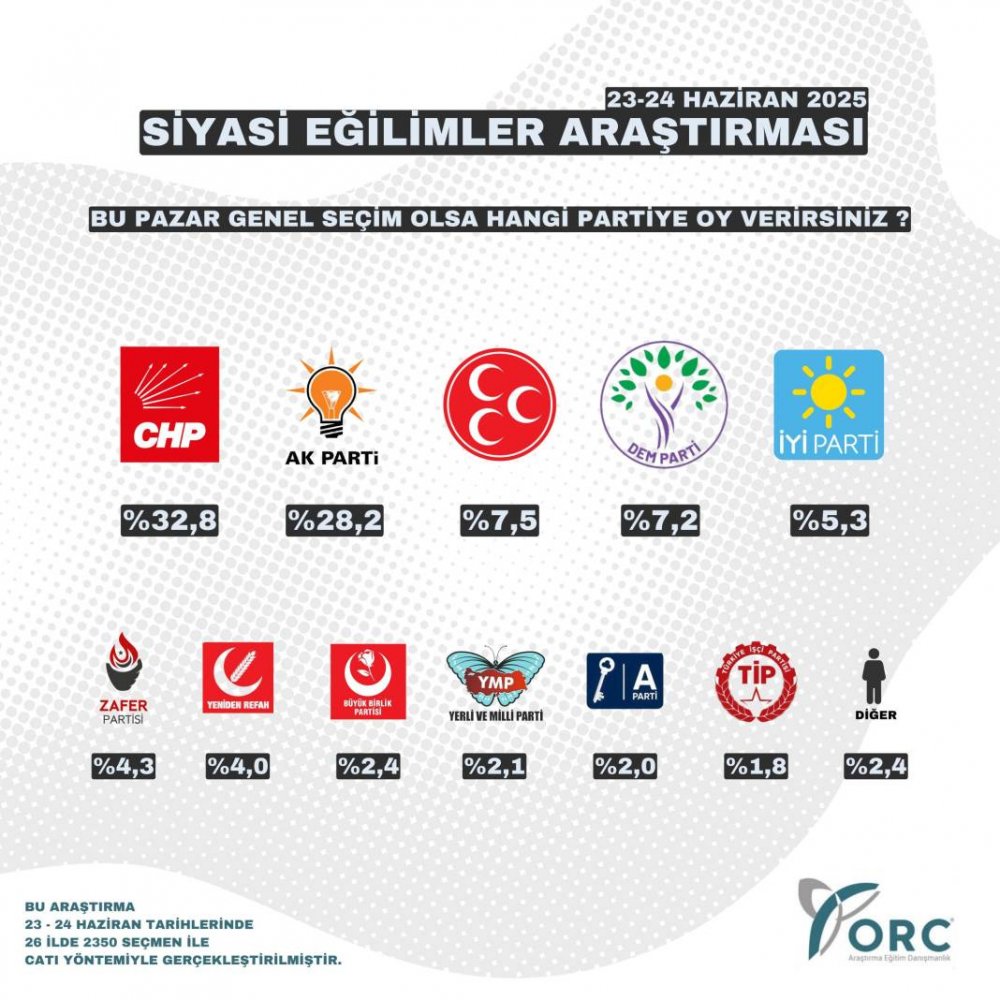 ORC Araştırma'nın yaptığı seçim anketine göre, katılımcıların yüzde 32,8'i CHP'ye, yüzde 28,2'si AKP'ye oy vereceğini ifade ediyor.