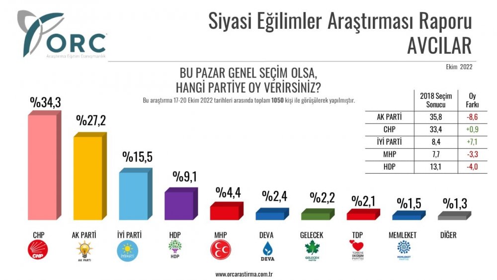 ORC Araştırma’nın verilerine göre İstanbul’un Üsküdar, Avcılar, Bahçelievler ve Şişli ilçelerinde AKP'nin oyları 2018 milletvekili seçimlerinden bu yana kayda değer oranda düştü. Şişli’deki azalma hariç CHP’nin oy oranı hemen hemen sabit kalırken, İYİ Parti'nin oylarını artırdı. HDP ve MHP’yse yüzde 2 ile 4 bandında oy kaybetti.