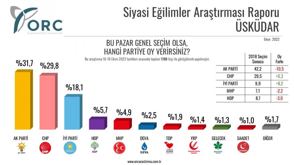 Şirketin sosyal medya hesabından yayınlanan verilere göre AKP’nin 2018 milletvekili seçimlerinde Üsküdar’daki yüzde 42,2’lik oy oranı 10,5 puan azalışla yüzde 31,7 oldu. AKP oy oranındaki düşüşle, ilçede yüzde 29,8 oy oranı olan CHP’yle örtüştü. İYİ Parti 8,2 puan artışla yüzde 18,1 olarak kaydedilirken HDP yüzde 3, MHP yüzde 2,2 oy kaybetti.