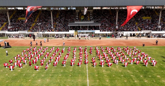 Özer Türk Stadı’ndaki programda, saygı duruşunda bulunulması ve İstiklal Marşı'nın okunmasının ardından Kaymakam İbrahim Keklik ve Başkan Ömer Günel, kent genelindeki okullardan gelerek törene katılan öğrencilerin bayramını kutladı. Öğrenciler ile okulların sergilediği halk oyunları ve çeşitli gösteriler, protokol üyeleri ve stadı dolduranlar tarafından ayakta alkışlandı.
