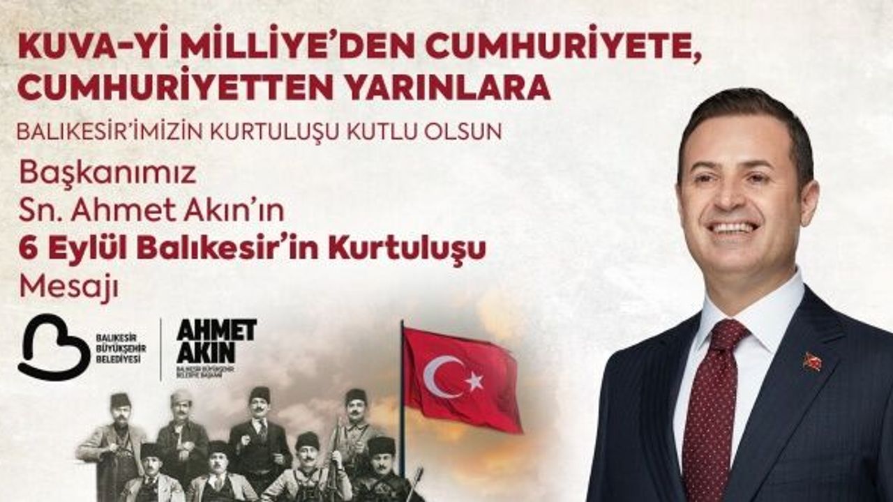 Balıkesir Büyükşehir Belediye Başkanı Ahmet Akın, 6 Eylül Balıkesir’in Kurtuluş Günü dolayısıyla bir mesaj yayımladı. Balıkesirliler için bağımsızlığımızın ve vatan sevdasının sarsılmaz simgesi olan 6 Eylül Balıkesir’in Kurtuluş Günü’nü gönülden kutladığını dile getirerek hemşehrilerinin bayram coşkusunu en kalbi duygularıyla paylaştığını vurgulayan Başkan Ahmet Akın, devamında şu ifadelere yer verdi: