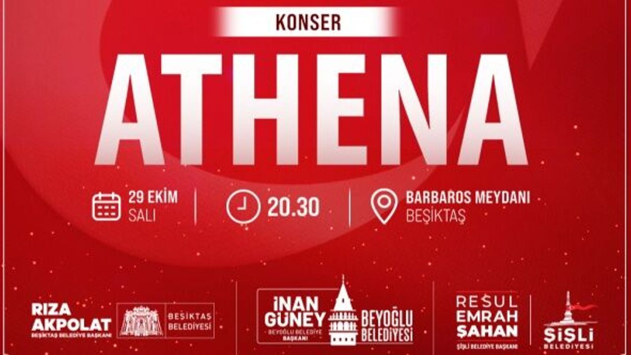 29 Ekim Cumhuriyet Bayramı kutlamaları, Cumhuriyet yürüyüşünün ardından saat 20.30’da Beşiktaş Barbaros Meydanı’nda gerçekleştirilecek Athena konseri ile devam edecek. Beşiktaş, Beyoğlu ve Şişli Belediye Başkanlarının da katılacağı konserde, Athena grubu en sevilen şarkılarını Cumhuriyet için seslendirecek.