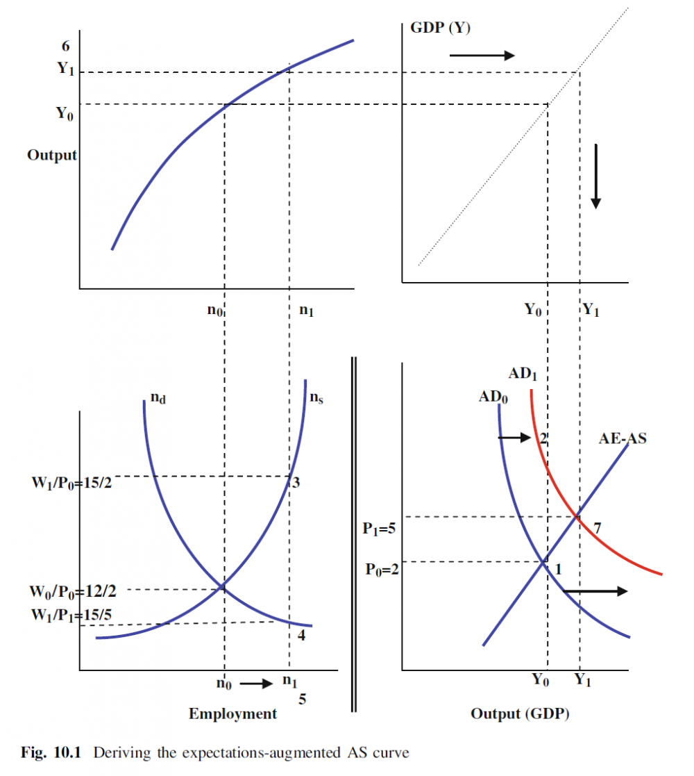 7. Sonuç olarak, toplam arz eğrisi (AE -AS eğrisi) Keynesyen yaklaşımınkine benzer pozitif yönlü bir arz eğrisine dönüşür. Böylece hükümet, toplam talebi artıran maliye ve para politikası önlemleriyle (enflasyonu artırma pahasına), istidamı artırabilir, işsizliği azaltabilir, ekonomiyi ve kişi başı milli geliri büyütebilir.