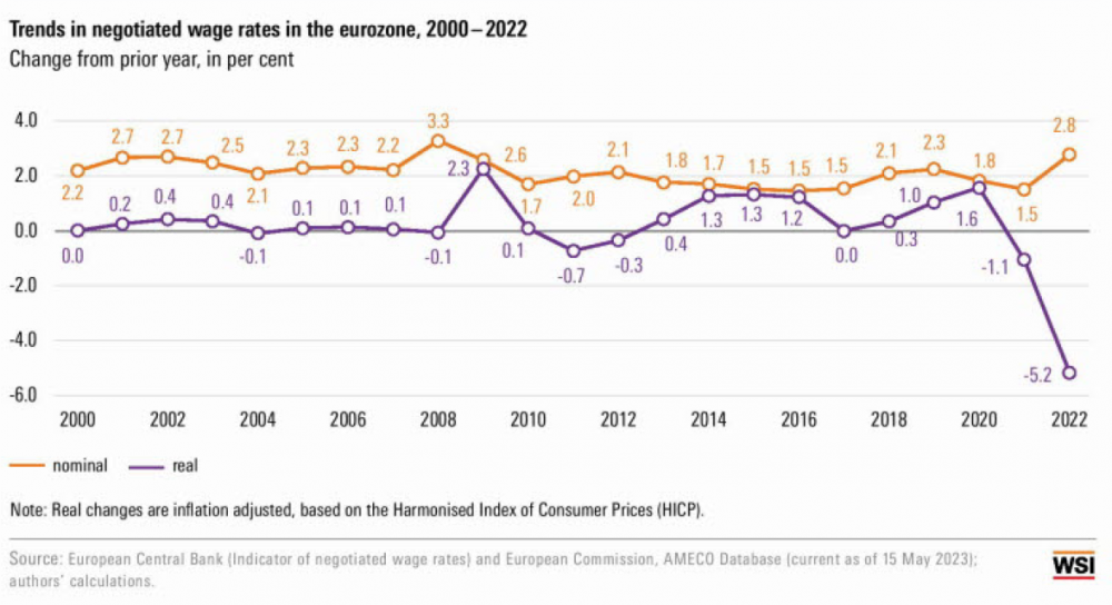 Uygulamada reel ücretlerin düşüş halinde olduğu bir gerçektir. Nitekim bu anlatıya uygun bir biçimde, aşağıdaki grafikten de görülebileceği gibi, Avrupa Birliği ülkelerindeki işçilerin reel ücretlerinin 2020 yılının ardından düşüşe geçtiği ve 2022 yılında bu düşüşün yüzde 5,2 olduğu görülmektedir. (2)