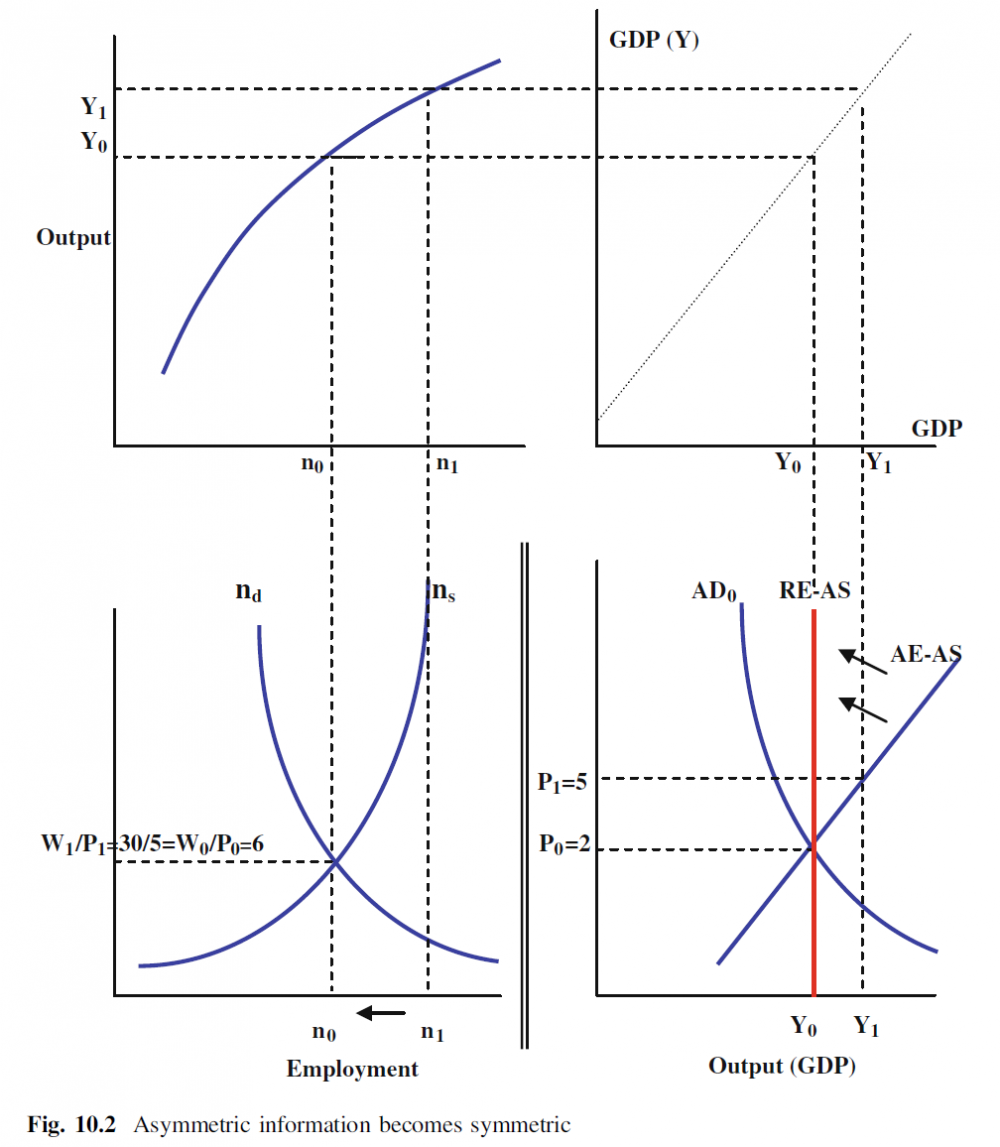 Yaklaşım böyle müdahalelerin ya da politikaların ekonomiyi sadece kısa vadede büyütebileceğini ancak uzun vadede bu büyümenin duracağını, istihdamın artmayacağını, işsizliğin azalmayacağını, sadece enflasyonun artacağını ileri sürer. Bunu yaparken de “asimetrik bilgi” kavramını modelinde temel analiz aracı olarak kullanır.