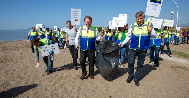 Bursa Büyükşehir Belediyesi personeli, çevre temizliğine dikkat çekmek amacıyla Gemlik ilçesindeki Kumsaz Plajı’nda sahil temizliği yaptı.
