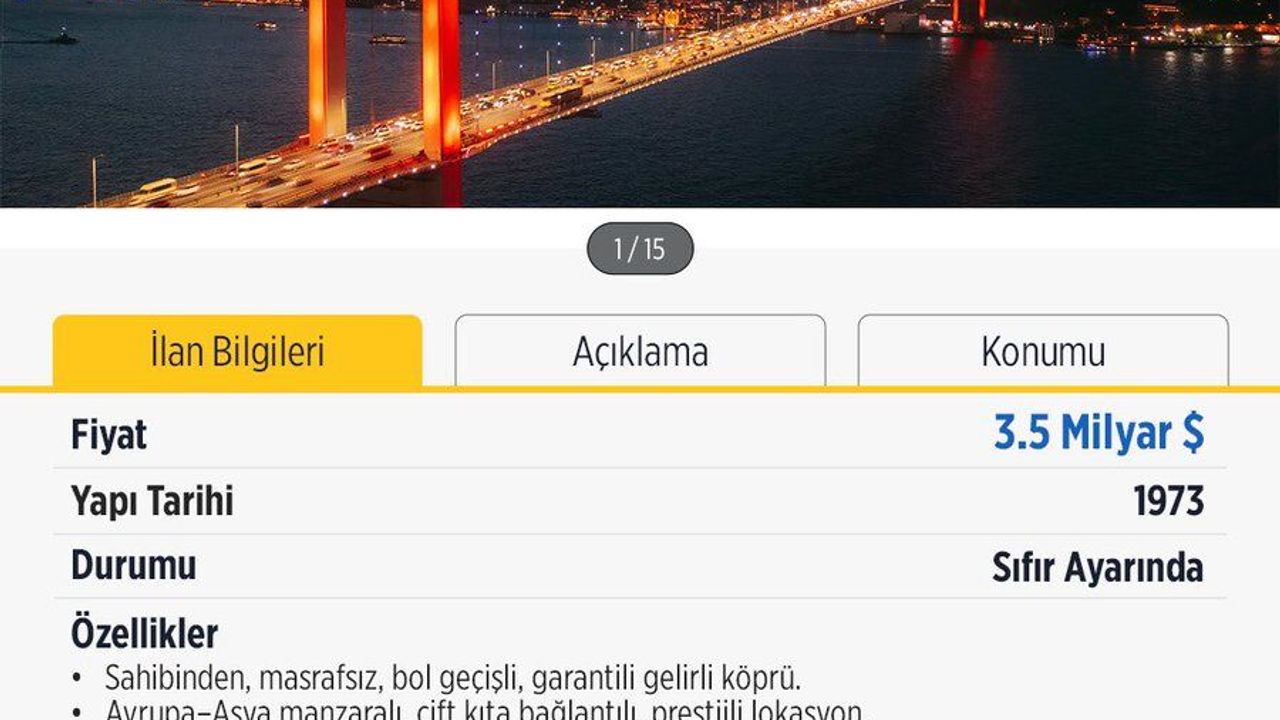 İlanda "Fiyat: 3,5 milyar lira | Durumu: Sıfır ayarında | Özellikler: Sahibinden, masrafsız, bol geçiş gelirli köprü. Avrupa-Asya manzaralı, çift kıta bağlantılı, prestijli lokasyon. Geçiş ücretleri enflasyona duyarlı sistem sayesinde güncellenir. Acil satılıktır, takas düşünülmez, yabancı alıcı tercih edilir" denildi.
