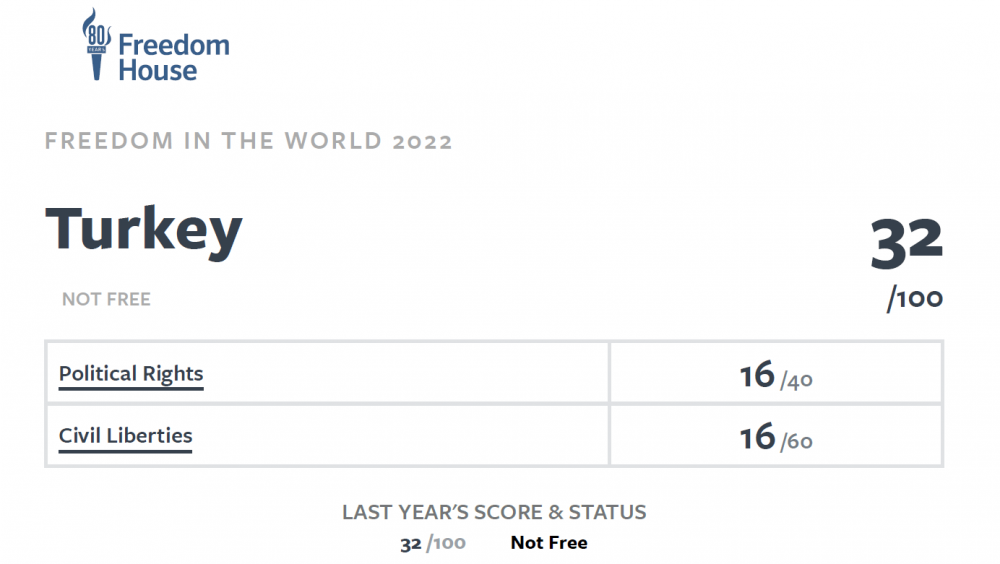 Son olarak, Freedom House’nin ‘2022 Yılı Dünyadaki Özgürlükler’ raporunda Türkiye, genel olarak 100 üzerinden 32 puanla (politik haklarda 40 üzerinden 16 ve insan hakları konusunda 60 üzerinden 16 puan ile) “Özgür Olmayan Ülke” (Not Free) olarak anılıyor. Yani özgürlükler ve demokrasi konusunda dünyanın en katı ve otoriter rejimleriyle aynı statüde değerlendiriliyor. (11)