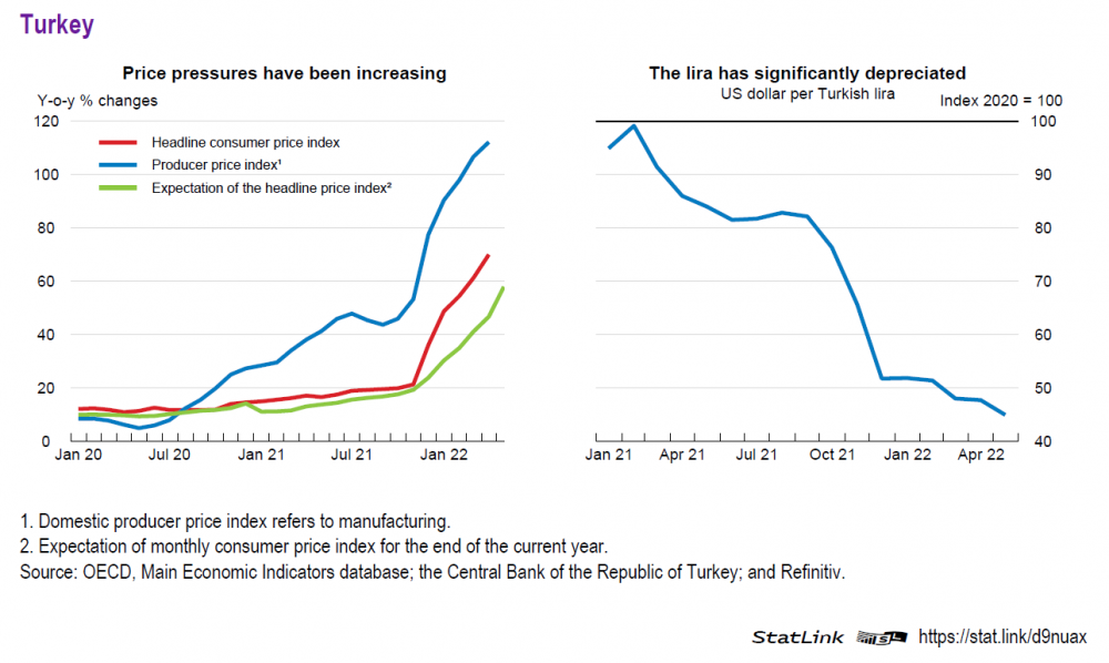 OECD’nin “Savaşın Fiyatı” başlıklı raporunda ise; “çok yüksek enflasyon, giderek azalan tüketici güveninin tüketim harcamalarını baskılaması ve jeopolitik riskler ve finansal koşulların zorluğunun neden olduğu belirsizlikler yüzünden yatırım harcamalarının durgun gitmesi, Ukrayna savaşının dış talebi ve meta fiyatlarını olumsuz etkilemesi yüzünden ihracatın da beklenen katkıyı verememesi gibi etkenler nedeniyle, Türkiye ekonomisinin büyüme oranının 2021 yılının çok gerisinde kalacağı ve yüksek meta ve gıda fiyatları ve izlenen para politikaları yüzünden enflasyonun çok yüksek düzeyde olacağı” öngörülüyor.