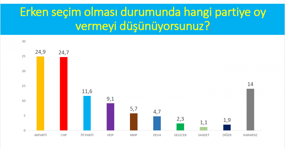 "Erken seçim olması durumunda hangi partiye oy vermeyi düşünüyorsunuz?" verilen yanıta göre partilerin oy oranları şöyle: