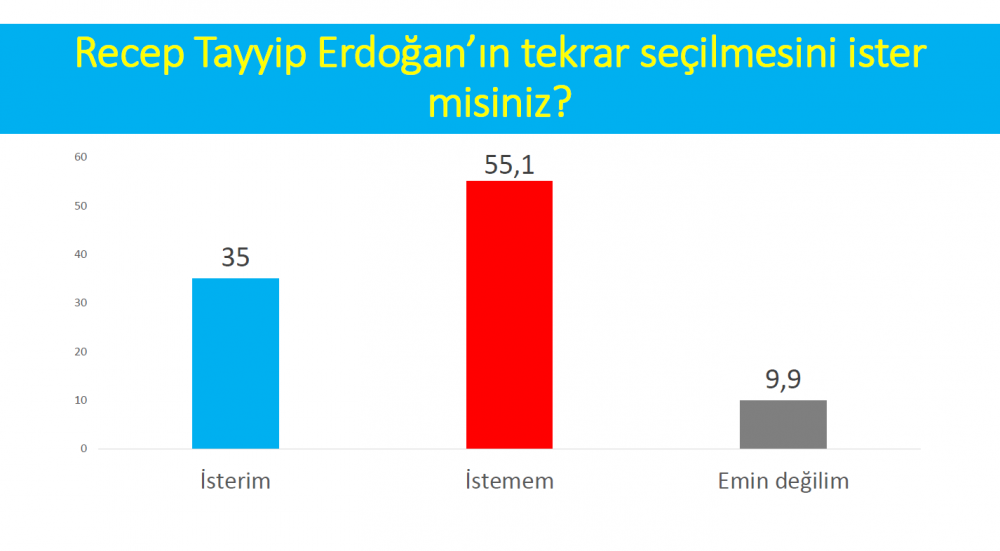 Araştırmaya göre, Recep Tayyip Erdoğan'ın tekrar Cumhurbaşkanı olmasını istemeyenlerin oranı yüzde 55,1. Erdoğan'a destek ise yüzde 35.