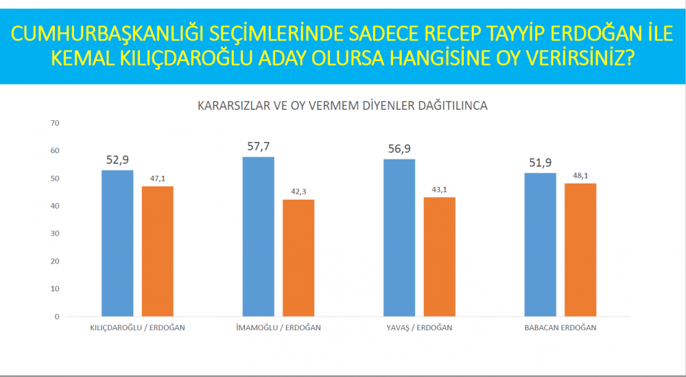Olası Cumhurbaşkanlığı seçimine dair soruya verilen yanıtlara göre, Cumhurbaşkanı Erdoğan; Kemal Kılıçdaroğlu, Mansur Yavaş, Ekrem İmamoğlu ve Ali Babacan karşısında geride görünüyor.