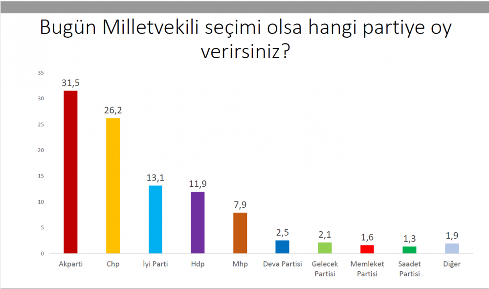 Ankette bugün seçimler olsa hangi partiye oy verecekleri sorulan seçmenler, yüzde 31,5 oranında Ak Parti'yi tercik ettiler. CHP yüzde 26,2; İyi Parti yüzde 13,1; HDP yüzde 11,9; MHP ise yüzde 7,9 oy oranına ulaştı.