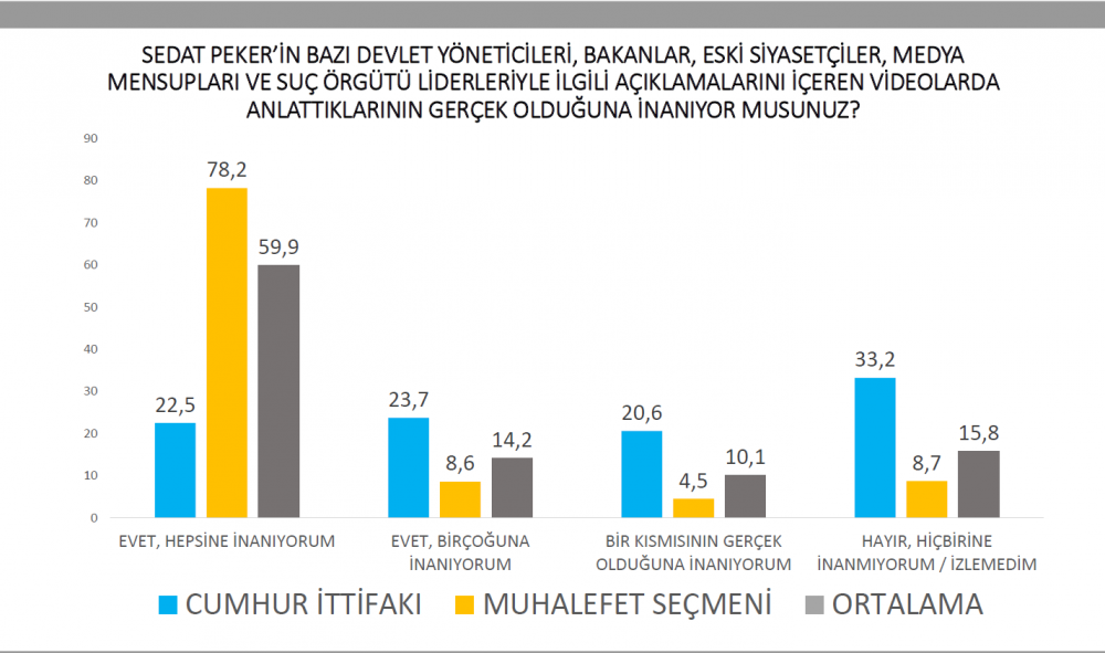 Avrasya Araştırma'nın 23-28 Mayıs arasında yaptığı anketin sonuçları paylaşıldı. 2480 kişinin katıldığı çalışmada yurttaşların büyük bir kısmı Sedat Peker'in açıklamalarına inandıklarını söyledi.
