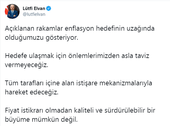 Elvan Twitter hesabından yaptığı açıklamada, “Tüm tarafları içine alan istişare mekanizmalarıyla hareket edeceğiz. Fiyat istikrarı olmadan kaliteli ve sürdürülebilir bir büyüme mümkün değil” dedi.