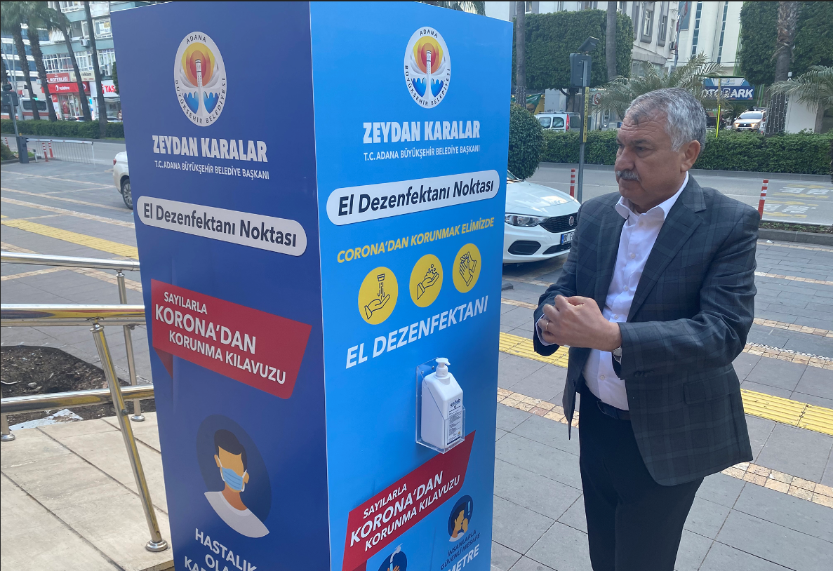 Otogar, havalimanı, Adana Büyükşehir Belediyesi, 15 ilçe belediyesi, gar, metro giriş ve çıkışları ile kentin kalabalık bölgelerinden oluşan 100 noktaya dezenfektan konuldu. Yine Adana Büyükşehir Belediyesine ait otobüslere 250 adet dezenfektan yerleştirildi.