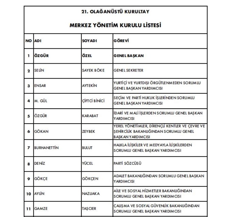 CHP MYK’nin tamamı, şu isimlerden oluştu: