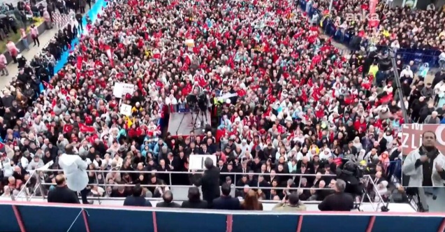 Dediler ki; "Yazın olmaz" dediniz, dedik, oldurdular. "Kışın soğuk" dedik, meydanları Çankırı’da dahi doldurdular eksi 4 derecede. Ama Denizli’de inanılmaz bir yağmur var. "Kimse gelmez, millet saçak altında durur. O meydan dolmaz, bugün bu miting patlar" dediler. Dediler ki; "Bir sahne var... Sahne, sahne var, önü çok büyük bir meydan." Dedim ki; "Yağmur varsa sahne olmaz. Millet yaşta, Genel Başkan kuruda olmaz!"