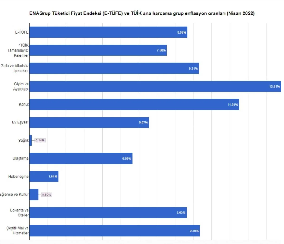 ENAG Tüketici Fiyat Endeksi (E-TÜFE) ve TÜİK ana harcama grup enflasyon oranları grafikte ürün alt-grup enflasyon oranları verilmiştir. TÜİK alt grupları gösterge olarak alındığında en az aylık artış yüzde 0,14 ile sağlık. En fazla yükseliş ise yüzde 13,81 ile giyim ve ayakkabı kaleminde gerçekleşti. En düşük artış ise sağlık kaleminde oldu.