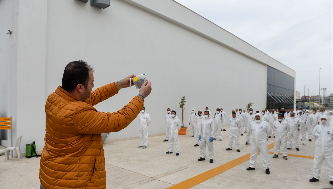 Muratpaşa Belediyesi, gerektiği anda yeni ekipler oluşturmak için salgın dolayısıyla kapanan belediye birimlerinde görevli çalışanlarını hazırda tutarken ilçedeki parklardan bankamatiklere, cadde ve sokaklara ve kamu kurumlarına her yeri temizleyip dezenfekte eden ekipler güne ASSİM’de toplantıyla başlıyor. Ekipler, her gün iş güvenliği uzmanı Mehmet Akmeşe’ye toplum sağlığıyla birlikte kendi sağlıklarını korumak için alınması gereken tedbirleri tek tek gözden geçiyor. Kullanılan maskeler, giydikleri özel kıyafetler ve ekipmanlar kontrol ediliyor ve tüm bunların tamamlanmasının ardından ekipler sokağa çıkıyor.
