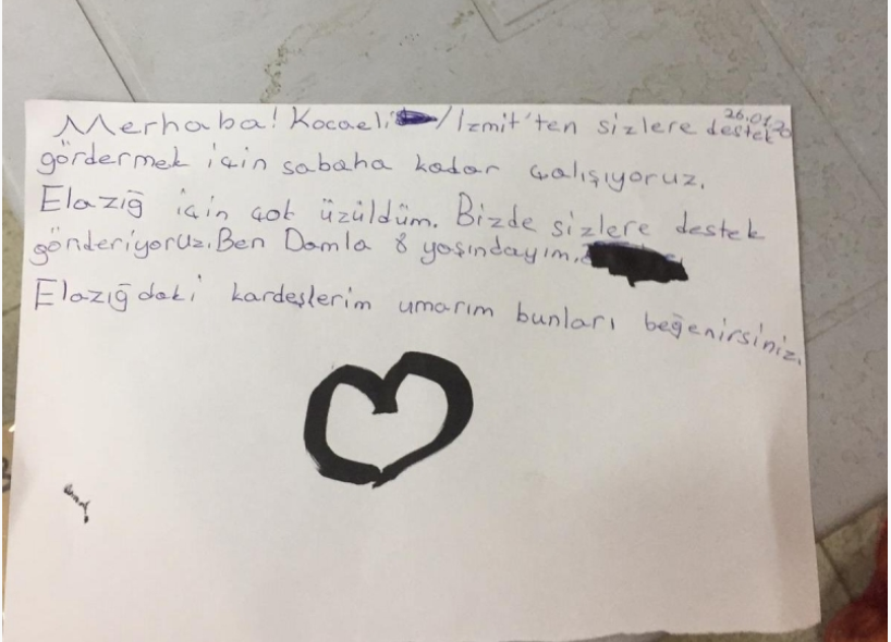 “Merhaba. Kocaeli İzmit’ten sizlere destek göndermek için sabaha kadar çalışıyoruz. Elazığ için çok üzüldüm. Bizde sizlere destek gönderiyoruz. Ben Damla 8 yaşındayım. Elazığ’daki kardeşlerim umarım bunları beğenirsiniz”