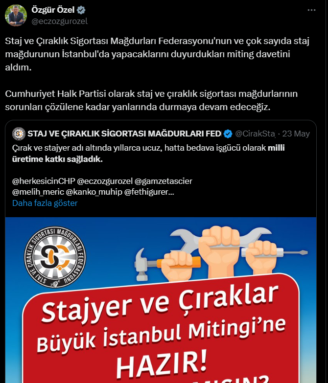 CHP Genel Başkanı Özgür Özel, Staj ve Çıraklık Sigortası Mağdurları Federasyonu'nun İstanbul'da düzenleyeceği mitinge davet edildiğini duyurdu.