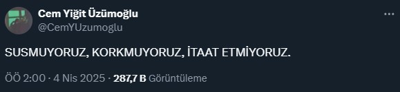 2 Nisan tüketim boykotu çağrılarına başlatılan soruşturması kapsamında gözaltına alındıktan sonra yurt dışına çıkış yasağıyla serbest bırakılan Oyuncular Sendikası yönetiminden oyuncu Cem Yiğit Üzümoğlu, yaptığı ilk paylaşımda "Sumuyoruz, korkmuyoruz, itaat etmiyoruz!" dedi.