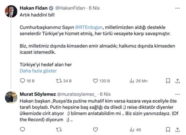 Hakan Fidan'ın Özel’e ilişkin yaptığı paylaşıma skandal bir yorum yapılırken TRT Haber Bayburt muhabiri Murat Söylemez, Putin örneğiyle Hakan Fidan'a seslendi.