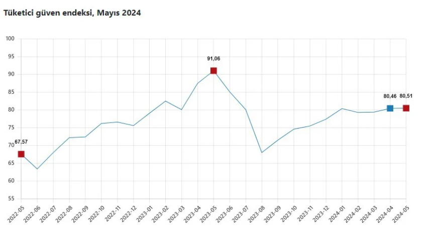 Türkiye İstatistik Kurumu ve Türkiye Cumhuriyet Merkez Bankası (TCMB) işbirliği ile yürütülen tüketici eğilim anketi sonuçlarından hesaplanan tüketici güven endeksi, nisan ayında 80,46 iken mayıs ayında yüzde 0,1 oranında artarak 80,51 oldu.