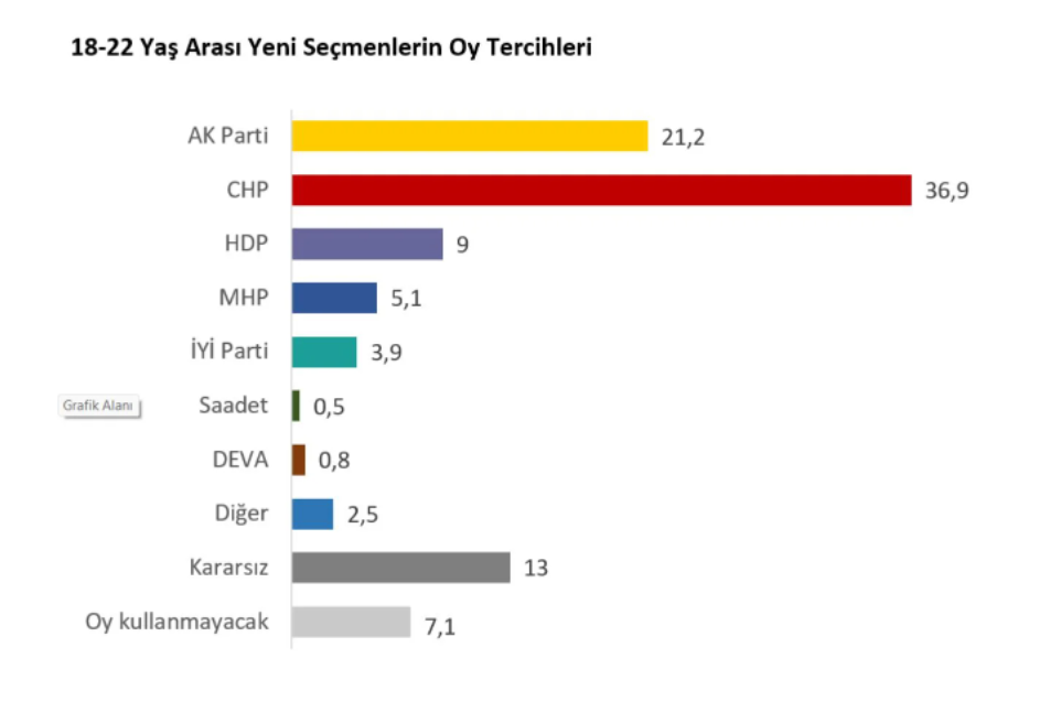 Ankette, AKP yüzde 21.2, HDP yüzde 9, MHP yüzde 5.1, İYİ Parti yüzde 3.9, Saadet yüzde 0.5, DEVA yüzde 0.8 oranında oy alıyor. Anketin en dikkat çekici yanlarından biri ise kararsız ve oy kullanmayacağını belirtenlerin oranı oldu. Buna göre katılımcıların yüzde 13'ü kararsız olduğunu söyledi. Oy kullanmayacağını ifade edenlerin oranıysa yüzde 7.1.