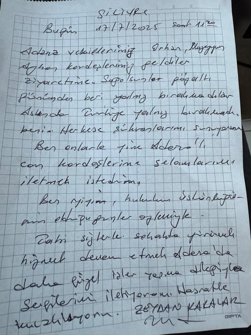 "Bugün Adana vekillerimiz Orhan, Müzeyyen ve Ayhan kardeşlerimiz geldiler ziyaretime. Sağolsunlar gözaltı günümden beri yalnız bırakmadılar. Aslında Türkiye yalnız bırakmadı beni. Herkese şükranlarımı sunuyorum. Ben onlarla yine Adanalı can kardeşlerime selamlarımı iletmek istedim.