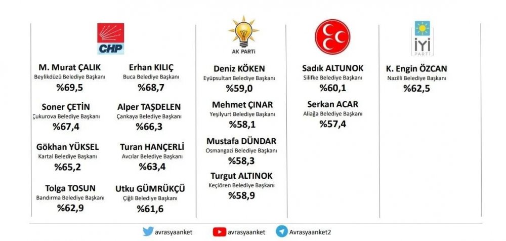 Avrasya Araştırma Aralık 2020 simülasyonu ile belediye başkanlarının son durumu belli oldu. 2020 yılında en başarılı belediyeler arasında CHP'li belediyeler öne çıkarken, Türkiye genelinde en başarılı ilçe belediyeleri sıralamasında ilk 5'te Beylikdüzü Belediye Başkanı M.Murat Çalık yüzde 69.5 oranla birinci olurken Buca Belediye Başkanı Erhan Kılıç yüzde 68.7 oranla ikinci, Çukurova Belediye Başkanı Soner Çetin de yüzde 67.4 oranla üçüncü, Çankaya Belediye Başkanı Alper Taşdelen yüzde 66,3 oranla dördüncü, Kartal Belediye Başkanı Gökhan Yüksel ise yüzde 65,2 oranla beşinci sırada yer aldı. İstanbul genelinde ise Beylikdüzü Belediye Başkanı M. Murat Çalık birinci olurken, Başkan Gökhan Yüksel ise ikinci sırada yer aldı.
