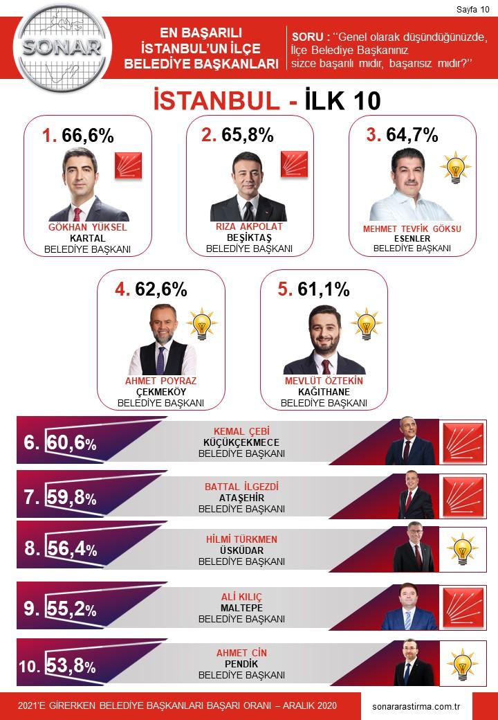 1 Kasım - 27 Aralık 2020 tarihinde yapılan ankette katılanlara "Genel olarak düşündüğünüzde, İlçe Belediye Başkanınız sizce başarılı mıdır?” sorusu soruldu. 20 büyükşehir belediyesinin 7 tanesinde yüz yüze, 13'ünde ise telefonla yapılan ankette “İstanbul’un En Başarılı İlce Belediye Başkanları” sıralamasında Kartal Belediye Başkanı Gökhan Yüksel % 66,6 ile en başarılı seçilirken, Beşiktaş̧ Belediye Başkanı Rıza Akpolat % 65.8’lik oranla ikinci, Esenler Belediye Başkanı Mehmet Tevfik Göksu % 64.7’lik oranla üçüncü sırada yer aldı.
