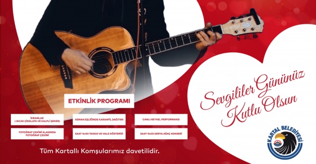 Kartal Belediyesi Kültür ve Sosyal İşler Müdürlüğü’nün her yıl 14 Şubat’ta düzenlediği ‘Sevgililer Günü’ programı ise saat 14.00-18.30 arasında Ankara Caddesinde yapılacak. Mini konser, tango ve vals gösterimi, karanfil dağıtımı, canlı heykel performansı ve fotoğraf çekiminin yapılacağı Ankara Caddesi’nde sevgi fırtınası yaşanacak. Saat 15.00’de ise Derya Ağaç konseri ile sevgililer günü etkinlikleri devam edecek.