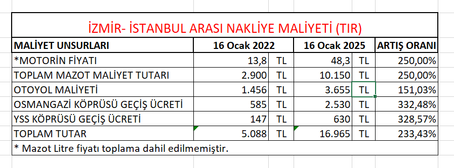 Otoyol, köprüler ve akaryakıta gelen zamlar, şehirlerarası nakliye maliyetlerini rekor düzeyde arttırdı. İstanbul –İzmir arasında yol kat eden ve nakliyecilik yapan TIR’ın yol masrafı 2022 yılında 5 bin 88 lira iken bu yıl ocak ayı itibariyle yüzde 233 artarak 16 bin 965 lira oldu.