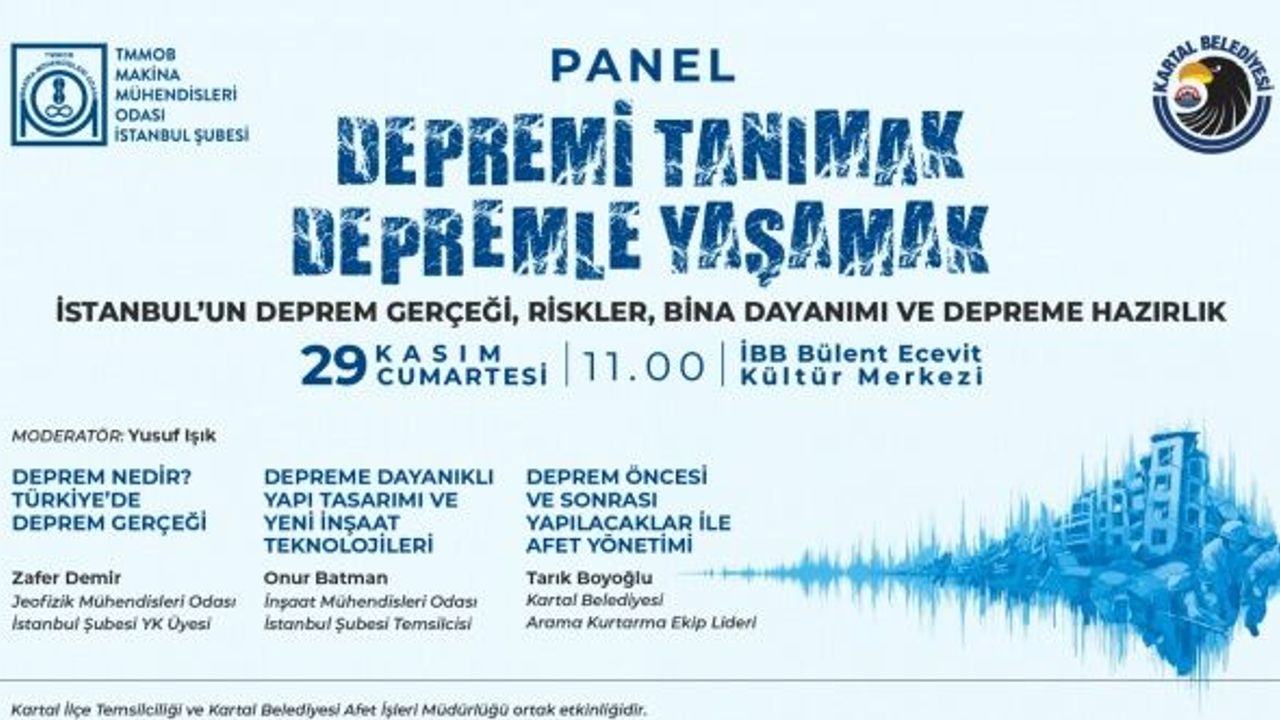 Kartal Belediyesi, Makina Mühendisleri Odası İstanbul Şubesi iş birliğiyle deprem gerçeğini farklı disiplinler ışığında ele alacak kapsamlı bir panele ev sahipliği yapacak. “Depremi Tanımak, Depremle Yaşamak” başlıklı etkinlik, 29 Kasım Cumartesi günü saat 11.00’de İBB Bülent Ecevit Kültür Merkezi’nde gerçekleştirilecek.