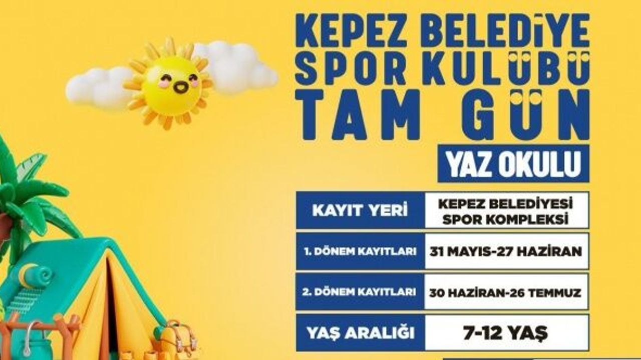 Kepez Belediyesi Spor Kulübü, yaz tatilini verimli ve eğlenceli geçirmek isteyen çocuklar için tam gün yaz okulu düzenliyor. Başkan Mesut Kocagöz, tüm çocukları bu renkli ve öğretici Yaz Okulu’na katılmaya davet etti.
