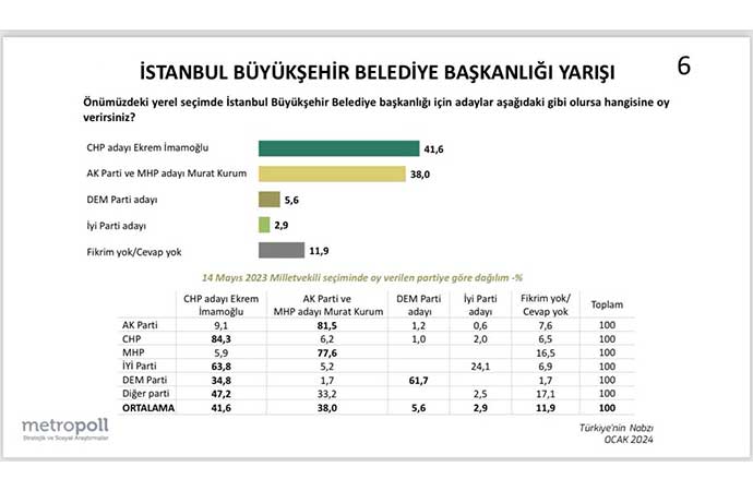 İmamoğlu yüzde 41.6, Murat Kurum yüzde 38, DEM Parti adayı yüzde 5.6 ve İyi Parti adayı yüzde 2.9 aldı. Yüzde 11.9’u “Fikrim yok” dedi.