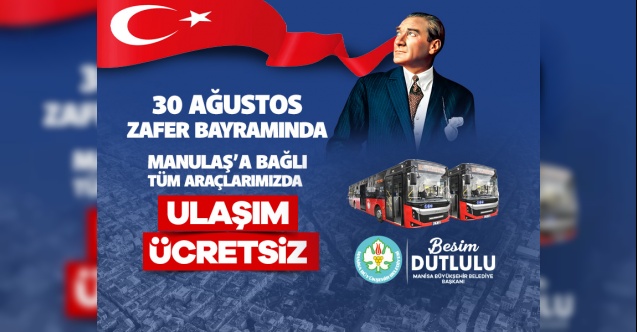 Manisa Büyükşehir Belediye Başkanı Besim Dutlulu, her bayram olduğu gibi bu büyük bayramda da vatandaşların toplu taşıma araçlarından ücretsiz olarak faydalanabileceğini söyledi. Tüm vatandaşların bayramını kutlayan Başkan Dutlulu, “Manisa Büyükşehir Belediyesi olarak bu büyük bayramda, vatandaşlarımıza ücretsiz ulaşım imkanı sağlıyoruz. Manisa Büyükşehir Belediyemize ait resmi toplu taşıma araçları (Kırmızı Otobüsler) ve MANULAŞ bünyesindeki otobüslerimiz, 30 Ağustos Zafer Bayramı'nda tüm halkımıza ücretsiz hizmet verecektir” dedi.