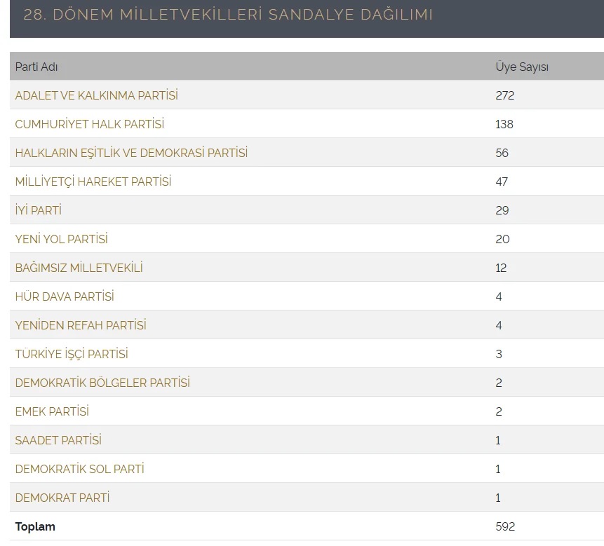 Yeni Yol Grubu'nun milletvekili sayısı 20'ye, DEVA Partisi'nin milletvekili sayısı da 8'e düşerken, AK Parti'nin milletvekili sayısı ise 275 oldu.