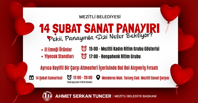 Mezitli Belediyesi, 14 Şubat’ta kente renk katacak özel bir etkinliğe daha imza atıyor. Sanatı ve üretimi desteklemek, el emeği üreticilerini vatandaşlarla buluşturmak amacıyla düzenlenen Sanat Panayırı, gün boyu sürecek dopdolu programıyla Mezitli Sanat Çarşısı’nda kapılarını açacak.